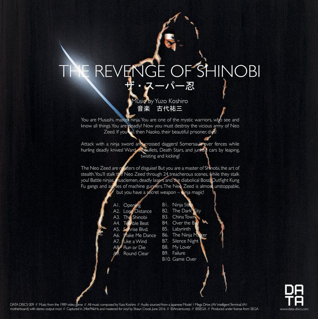The Revenge of Shinobi is presented as a 180g LP, cut at 45rpm and packaged in a 425sgm outer sleeve, with heavyweight inner sleeve and double-sided lithographic print, featuring original artwork sourced from the SEGA archives in Japan. The release also includes exclusive liner notes written by Koshiro himself.