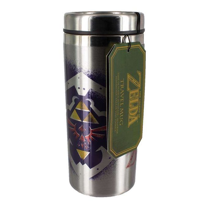 Det är farligt att gå ensam! Ta denna! Eftersom att det ju finns restriktioner mot svärd i lokaltrafiken så föreslår vi istället denna resemugg. Links resemugg håller din dryck varm eller kall. Den är gjord i rostfritt stål och har dubbla väggar för extra värmeisolering. Muggens utsida pryds av Links sköld med Hyrule logon och på andra sidan av Link själv i full stridsmundering. Muggen går att försluta och öppna med en flärp på ovansidan.